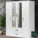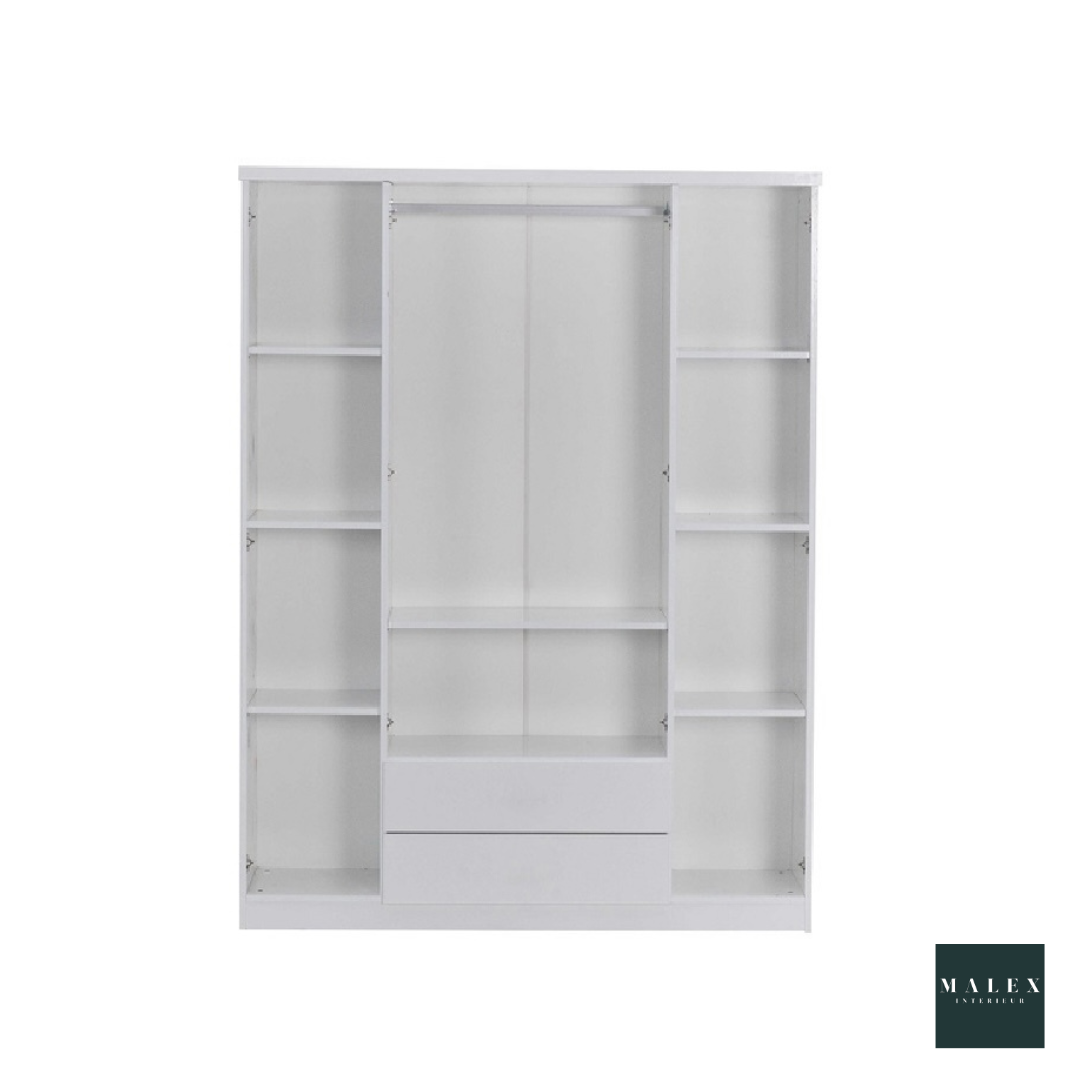 Découvrez l’armoire 4 portes moderne idéale pour les intérieurs de styles divers. L’armoire est équipée de plusieurs étagères et d’une tringle.