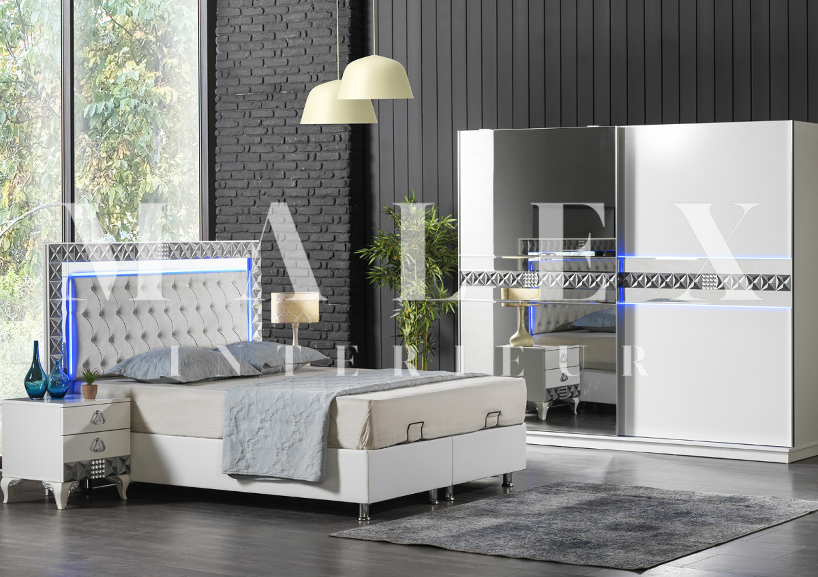 Cette magnifique chambre complète alliance s’harmonisera facilement à votre chambre à coucher. Elle est composée d’un lit, de deux chevets, d’une armoire et d’une commode avec miroir. Un ensemble élégant et moderne qui s’adapte à tous style.