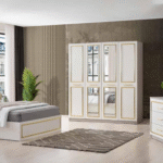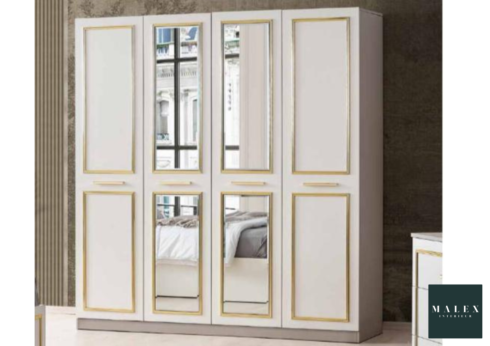 Elle est composée d’un lit, de deux chevets, d’une armoire et d’une commode avec miroir.