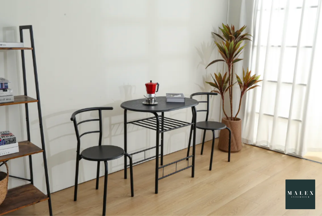Une table à manger parfaite pour les petits espaces dans le salon, salle à manger ou bien en terrasse. Elle est complété de deux chaises idéales aussi pour les petits espaces.