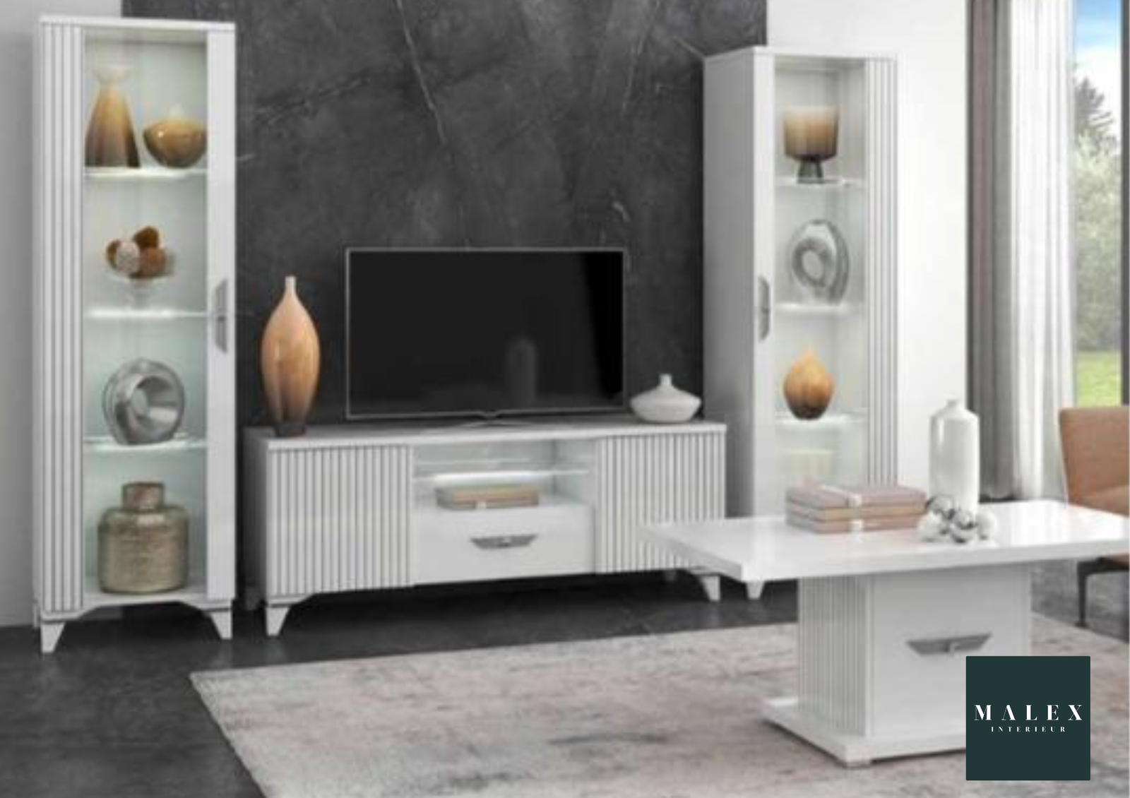 Sublimez votre salon avec cet ensemble élégant et fonctionnel, composé d’un meuble TV spacieux et de deux vitrines assorties. Grâce à ses lignes modernes et à sa finition soignée, il apporte une touche contemporaine à votre intérieur. Les vitrines, dotées d’étagères vitrées, sont parfaites pour exposer vos objets déco, tandis que la porte centrale offre un espace de rangement pratique pour vos accessoires multimédias. Un ensemble complet pour un salon organisé et stylé.