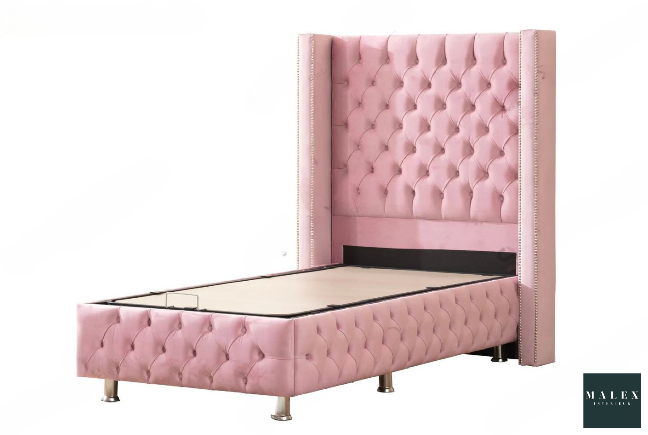 Ce somptueux lit coffre clou s’harmonisera facilement à votre chambre à coucher avec sa tête de lit vêtu d’un tissu velours, il s’intégra parfaitement à votre décoration.