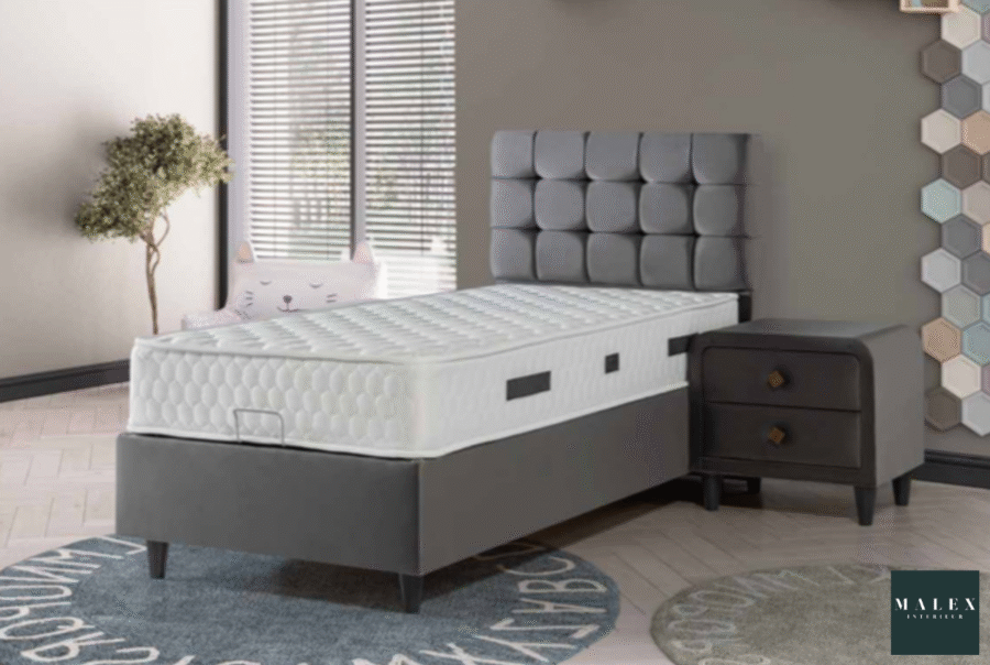 Ce somptueux lit coffre clou s’harmonisera facilement à votre chambre à coucher avec sa tête de lit vêtu d’un tissu velours, il s’intégra parfaitement à votre décoration.