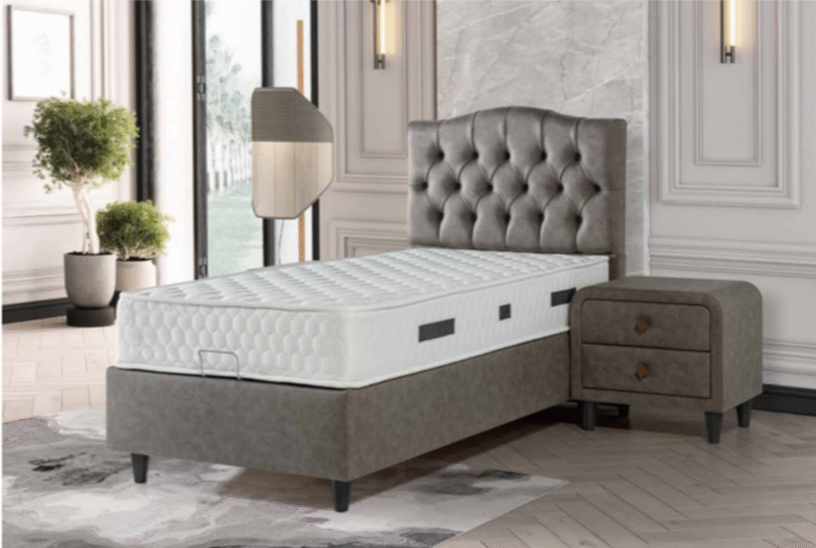 Ce somptueux lit coffre clou s’harmonisera facilement à votre chambre à coucher avec sa tête de lit vêtu d’un tissu velours, il s’intégra parfaitement à votre décoration.