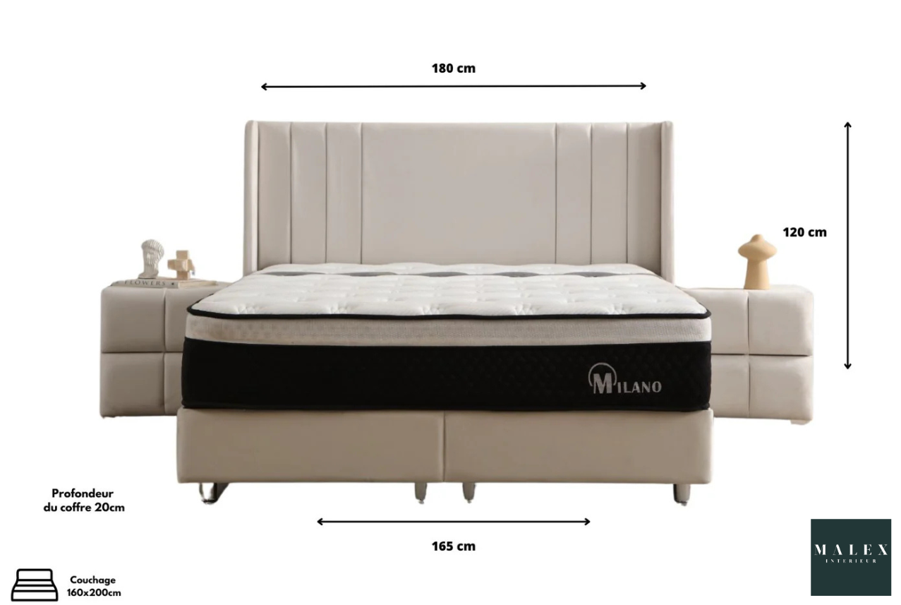 Ce somptueux lit coffre clou s’harmonisera facilement à votre chambre à coucher avec sa tête de lit vêtu d’un tissu velours, il s’intégra parfaitement à votre décoration.