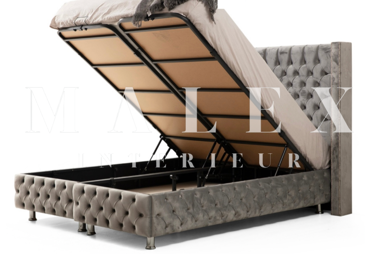 Ce somptueux lit coffre clou s’harmonisera facilement à votre chambre à coucher avec sa tête de lit vêtu d’un tissu velours, il s’intégra parfaitement à votre décoration.
