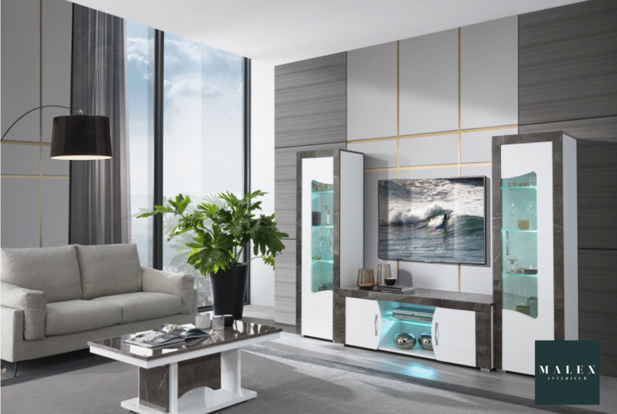 Découvrez notre séjour Mascara, composé d’un meuble TV, de deux vitrines une porte, d’une vitrine deux portes, d’une table basse, d’un buffet avec miroir et d’une table à manger. Une gamme élégante et tendance.