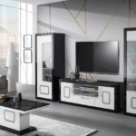 Découvrez notre séjour Victoria, composé d’un meuble TV, de deux vitrines une porte, d’une vitrine deux portes, d’une table basse, d’un buffet avec miroir et d’une table à manger.