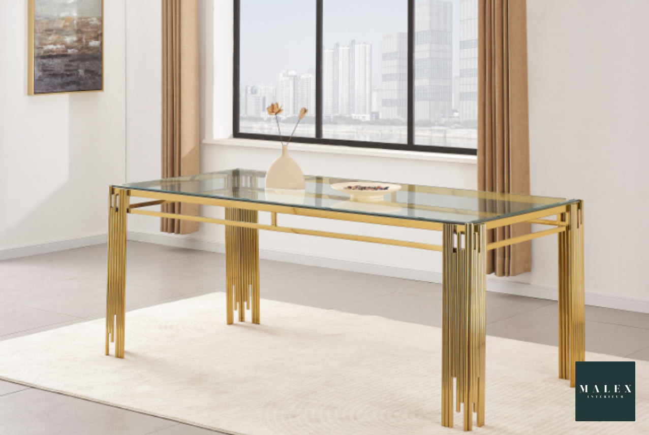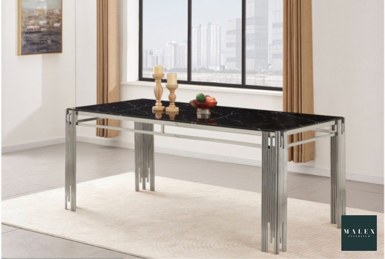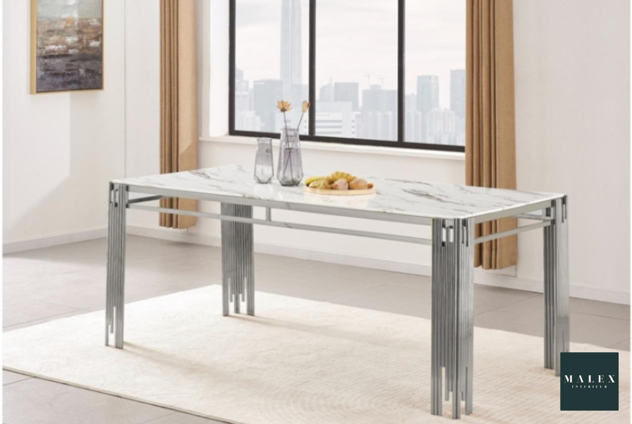 Table à manger Flute, avec structure en acier inoxydable et plateau effet marbre.